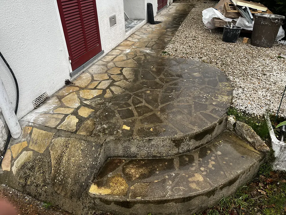 Enfin, notre équipe a procédé à un nettoyage haute pression de la terrasse pour retirer mousses, lichens et salissures incrustées, redonnant tout son éclat à l’espace extérieur.